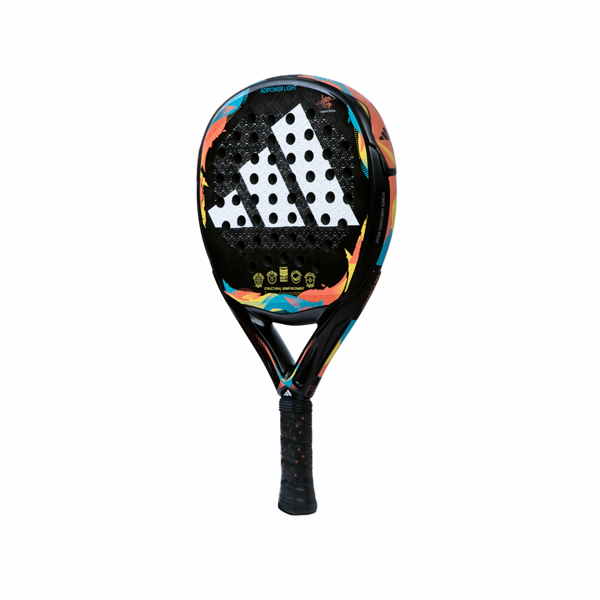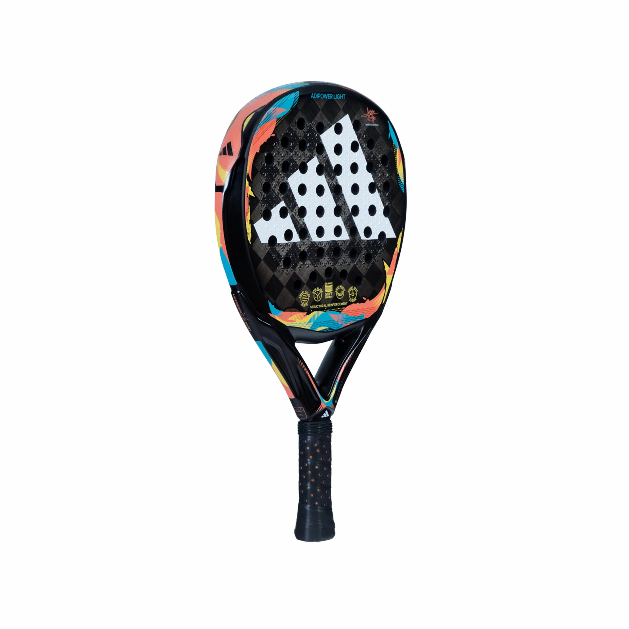 The Adipower Light 3.2 is a round shaped padel racket designed to dominate the game from start to finish with power and control. It is a racket with excellent manageability thanks to its low weight and geometry, it also offers optimal comfort in all hits due to the EVA High Memory rubber and unlimited power thanks to the aluminized carbon fiber on the surface and the