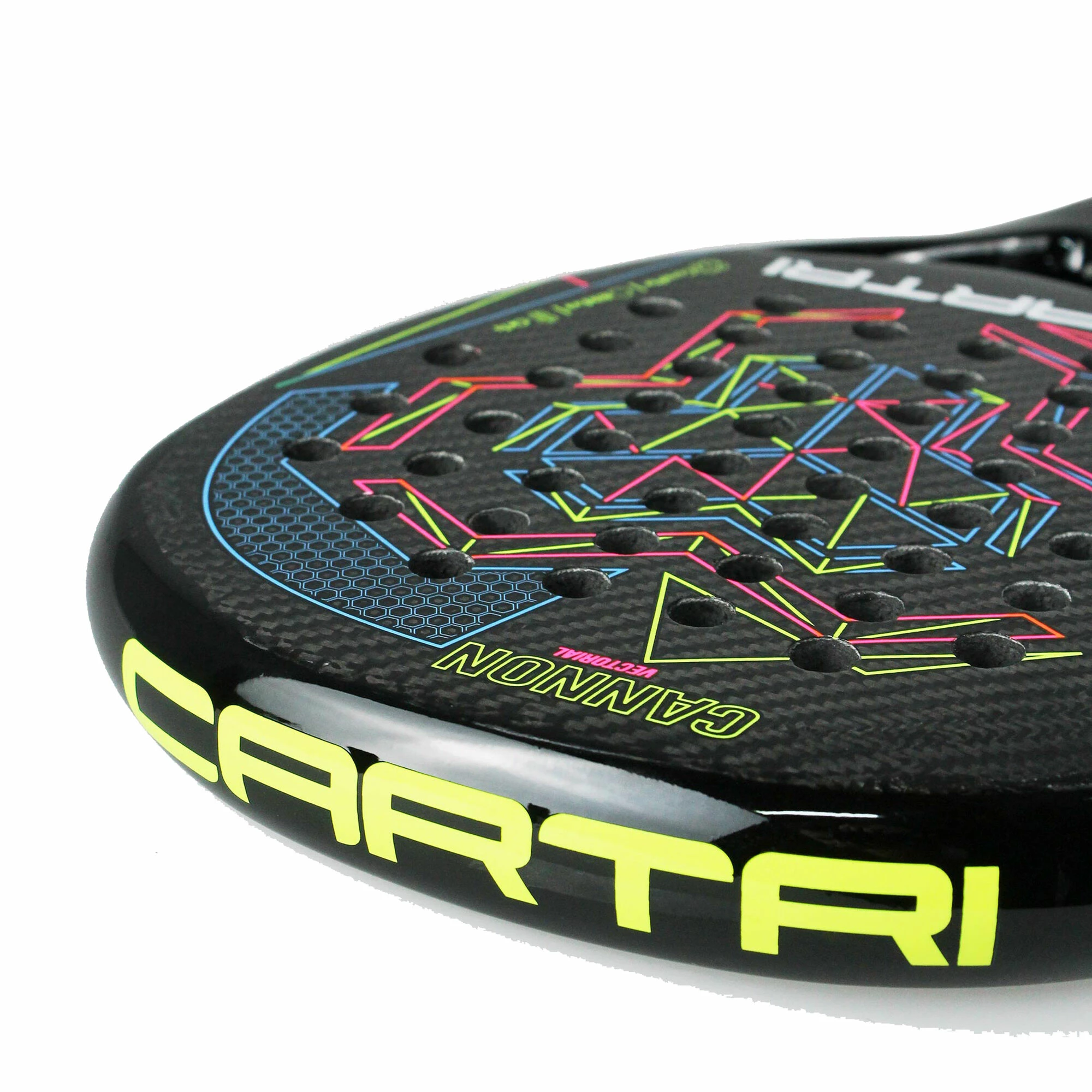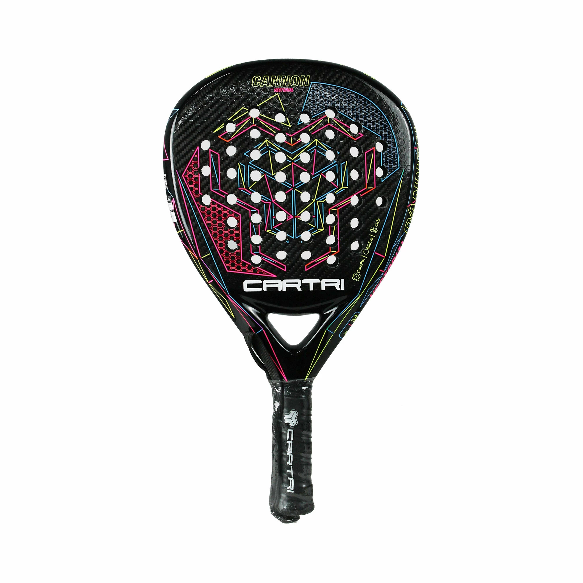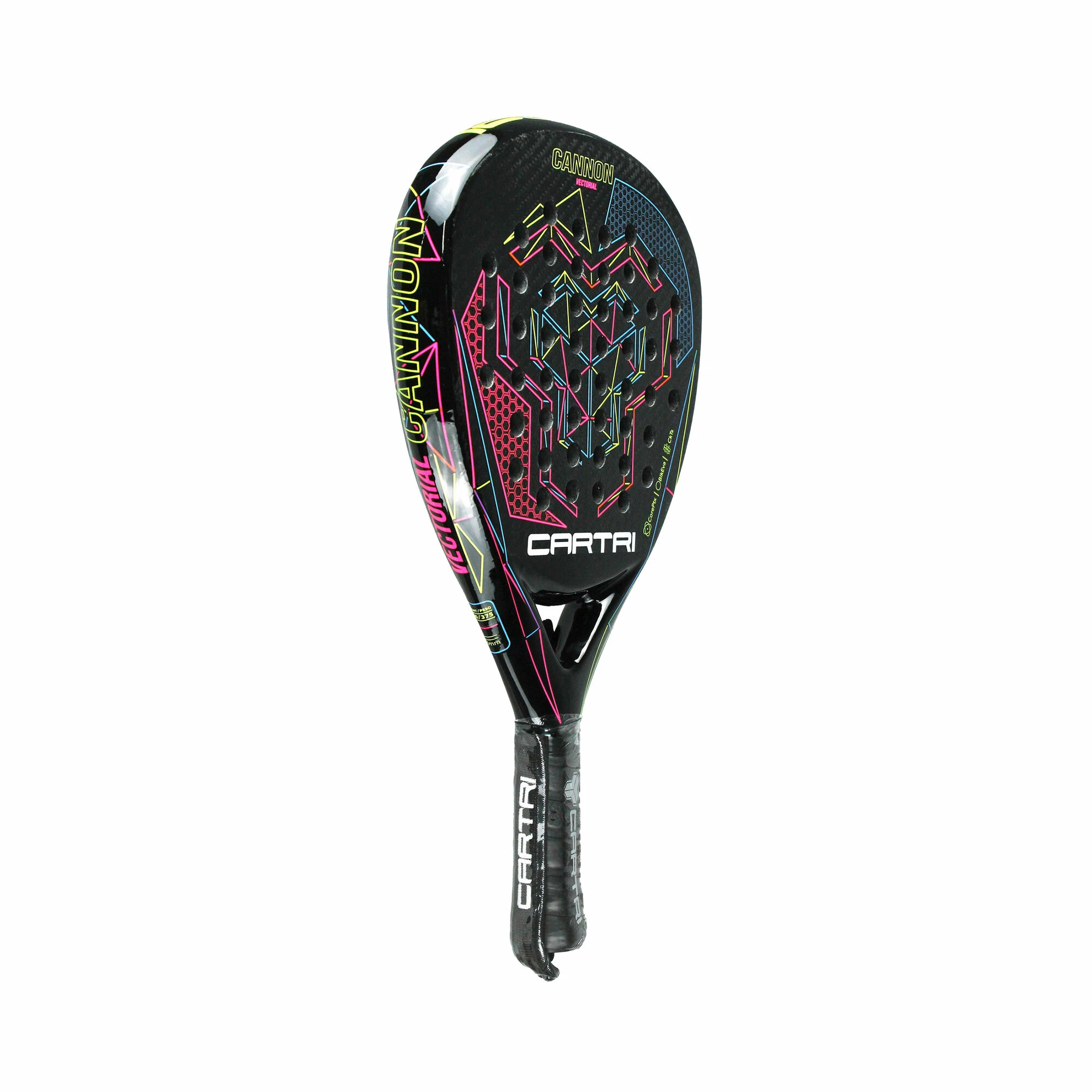 The new Cannon Vector padel racket is a teardrop-shaped racket with in a mid-high balance. It is composed of hybrid faces of Fiberglass and Carbon, and the core of Eva Soft Black rubber. This composition allows to have a good ball output while maintaining a high level of precision in the strokes. The frame of the racket is 100% carbon, providing greater rigidity and durability, and at the same time reducing the vibrations of the blade.