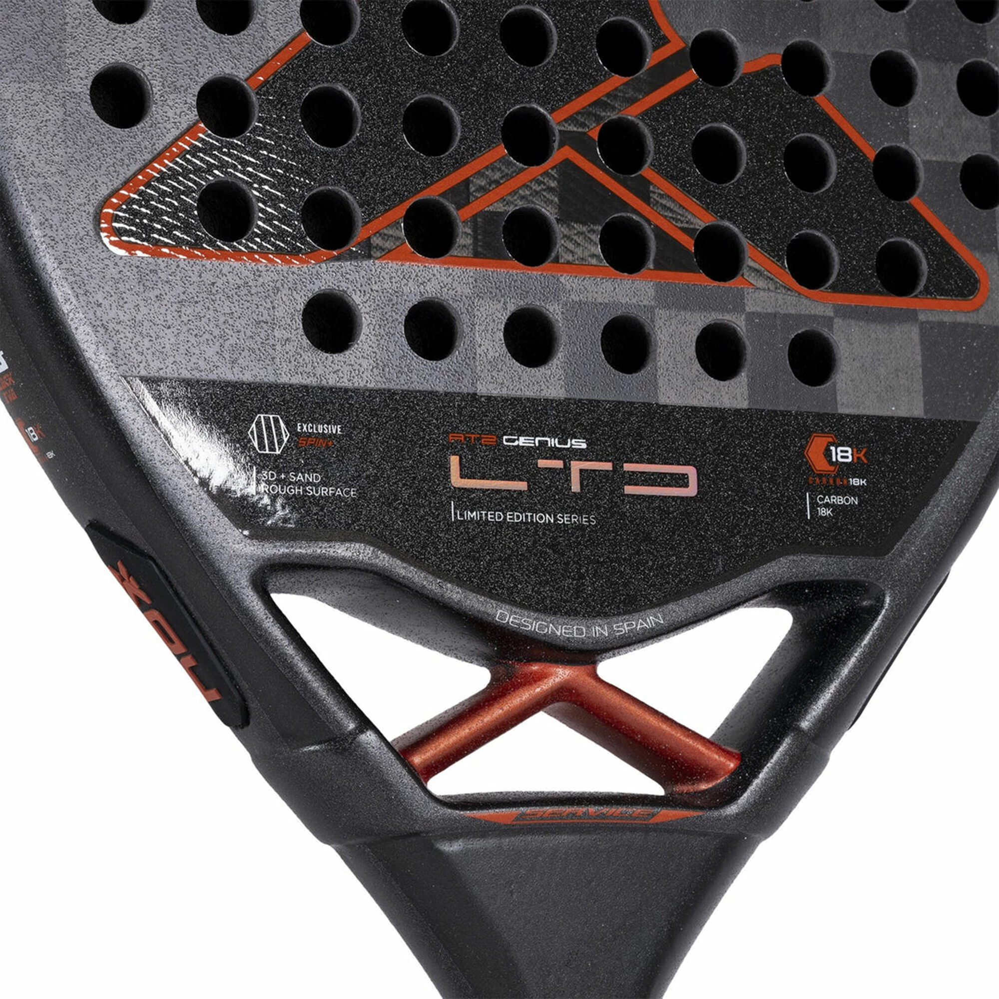 The new AT.2 Genius LTD 2023 Edition counts with 18K Carbon faces and HR3 Black EVA rubber. This materials combination provides a solid and consistent feel. The racket also incorporates Exclusive SPIN+ technologies, a highly durable double rough finish to improve ball grip on spin shots and the first patented system for replacing the safety cord in a padel racket: Smartstrap® now evolved in a compact piece for greater strength and safety.