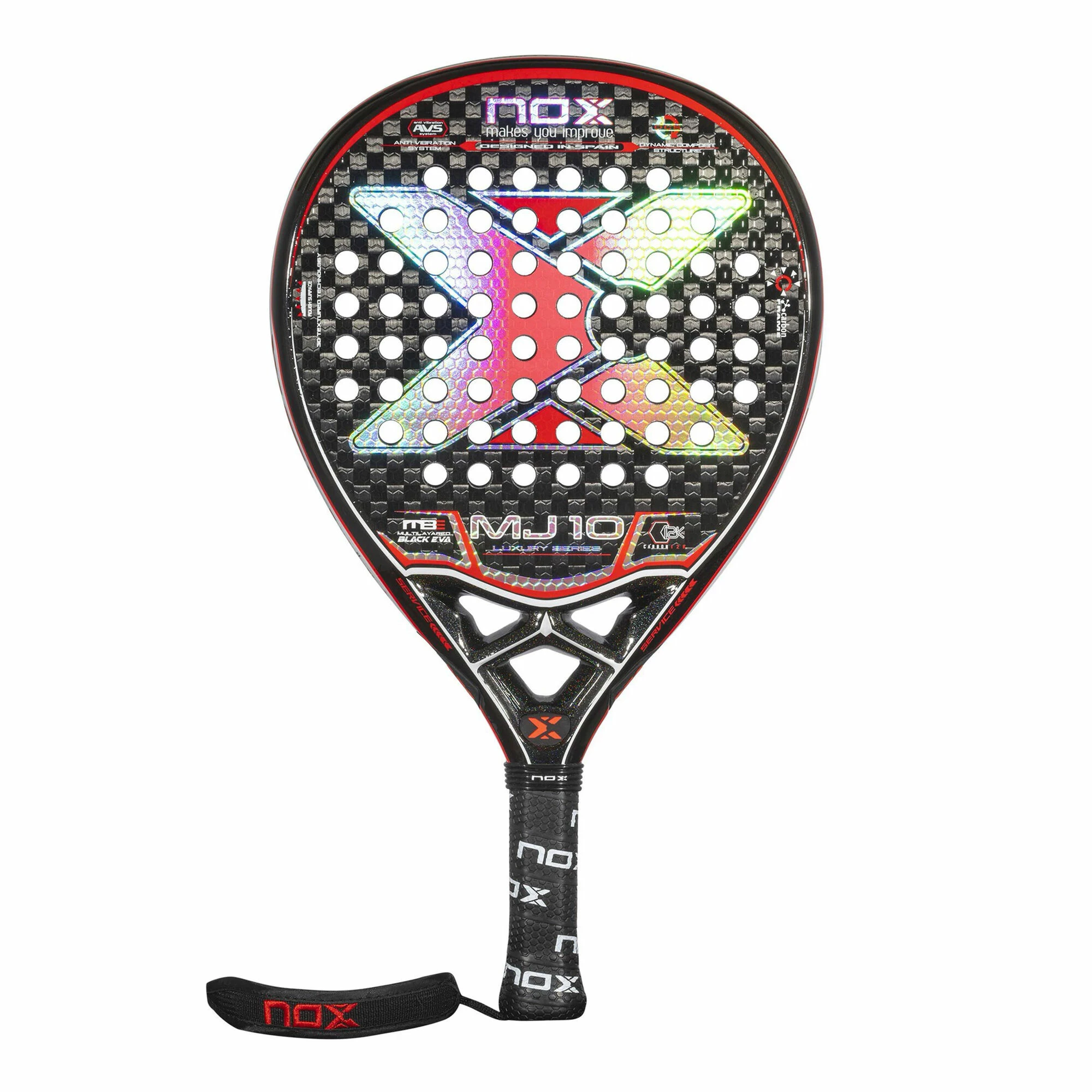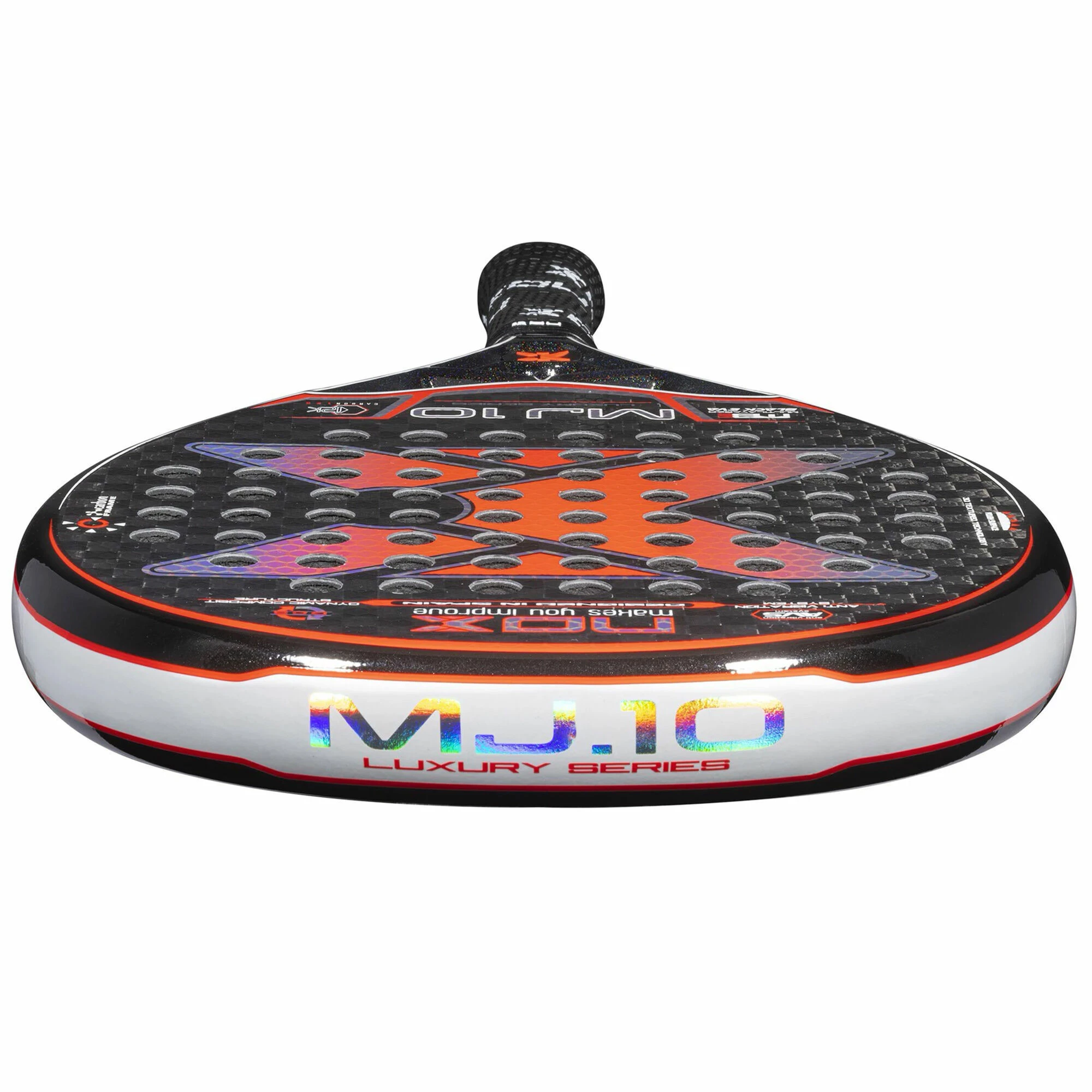 The MJ10 is the racket of the “World Padel Tour” player Majo Sánchez Alayeto. It is a teardrop-shaped racket with medium balance that provides great power and control. Provides maximum wear resistance thanks to the 100% carbon frame and 12K carbon surfaces. It is also composed of Black EVA rubber, which provides power when hitting. In addition, it has rough surfaces which will help to create more effect to the hits and the AVS lateral anti-vibration system to reduce the impact of vibrations on the elbow. Player Profile: Racket designed for advanced level players who are looking and are used to play with control on the court.