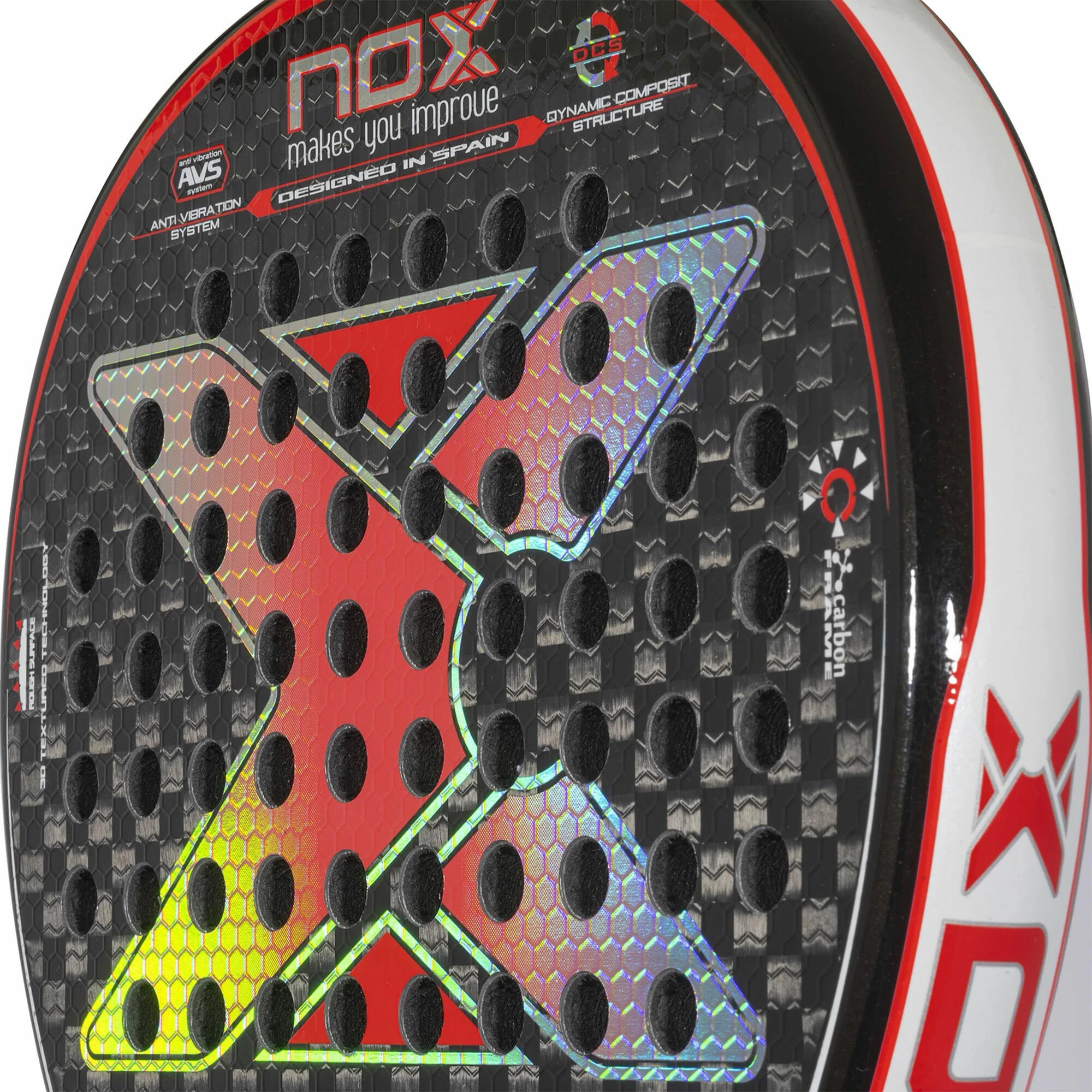 The 12K weave is achieved by interlacing the carbon fiber threads into small squares. The racket surfaces are composed by a 12K carbon fiber that will increase its hardness and durability. This material nourishes the racket with a harder touch that will be translated into greater power and explosiveness when hitting.
