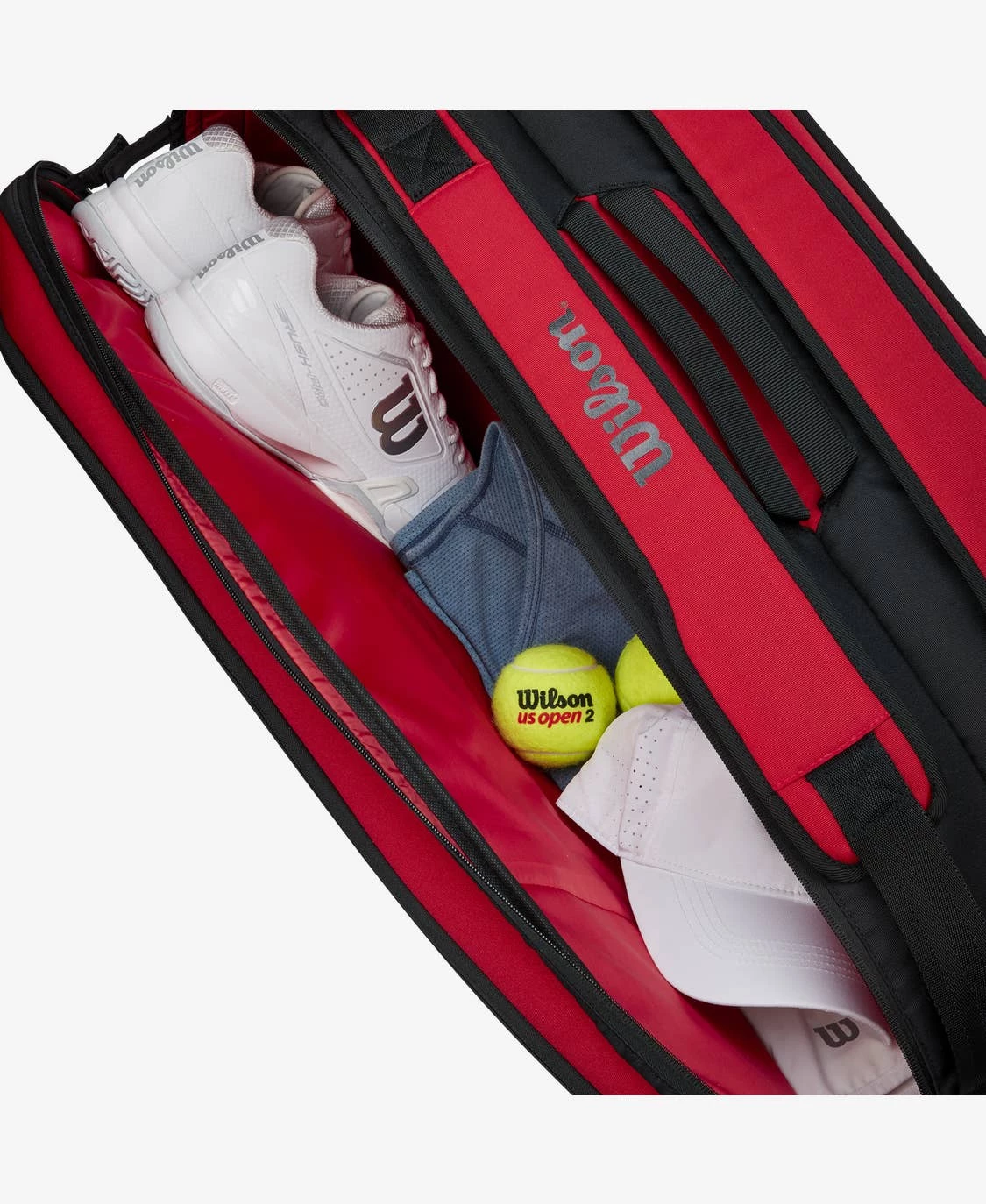 The perfect accomplice to a groundbreaking racket franchise, the Clash v2 Super Tour collection integrates rich, innovative design with a plethora of beneficial features for tennis players. This Super Tour 9 Pack holds up to nine tennis rackets across two main compartments for tennis equipment, including one lined with Thermoguard to protect against extreme temperatures. Additional features include a pair of large exterior side pockets for extra personal storage and a dual carry system for alternative modes of carrying. Comprising a recycled PET polyester shell fabric made from 21 PET bottles, this bag’s innovative design superbly complements the Clash v2 performance racket line with its rich, red hue and embossed Wilson logo.