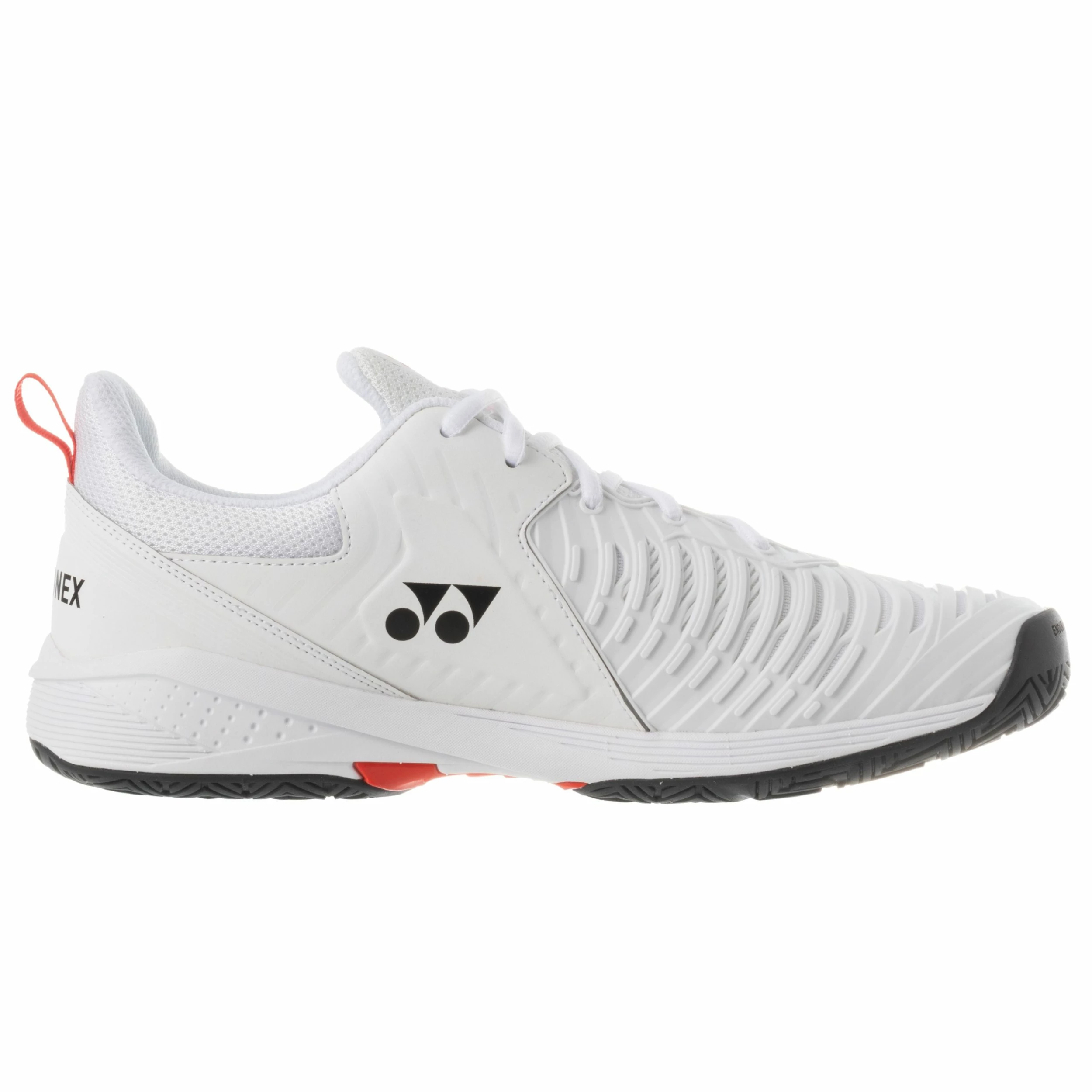 The Yonex Sonicage 3 is the comfort play of the Yonex footwear family. The shoe comes in two variants. The standard, presented here, fits a little narrower than the rest of the Yonex footwear offerings. This fits close to a C width foot and is comparable to the ASICS Solution Speed FF2. The wide version of this shoe fits wider than the rest of the Yonex footwear offerings and is closer to an E width. Both models of the Sonicage 3 provide ample cushion and support for the avid tennis player. If you are an aggressive tournament player, you might be better off with the Yonex FusionRev 4 or the Yonex Eclipsion 4.